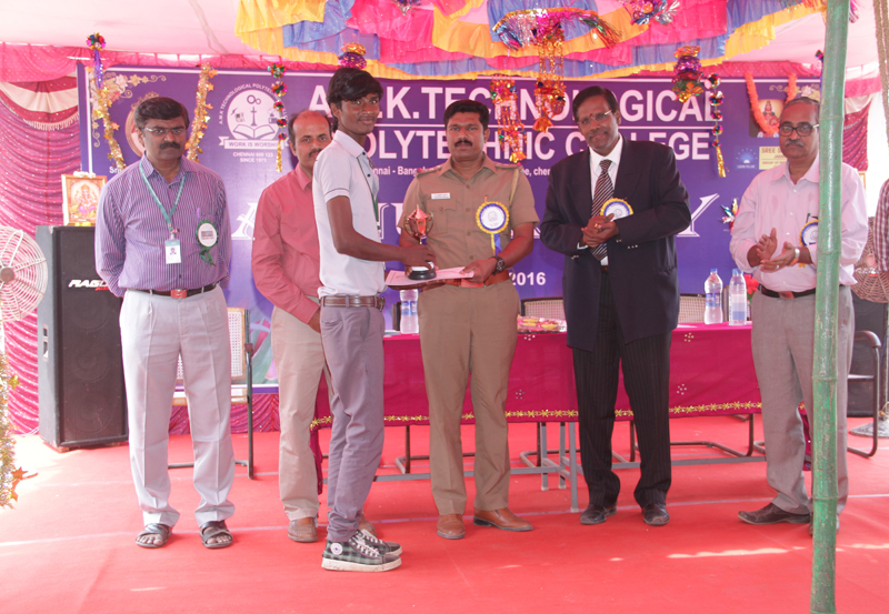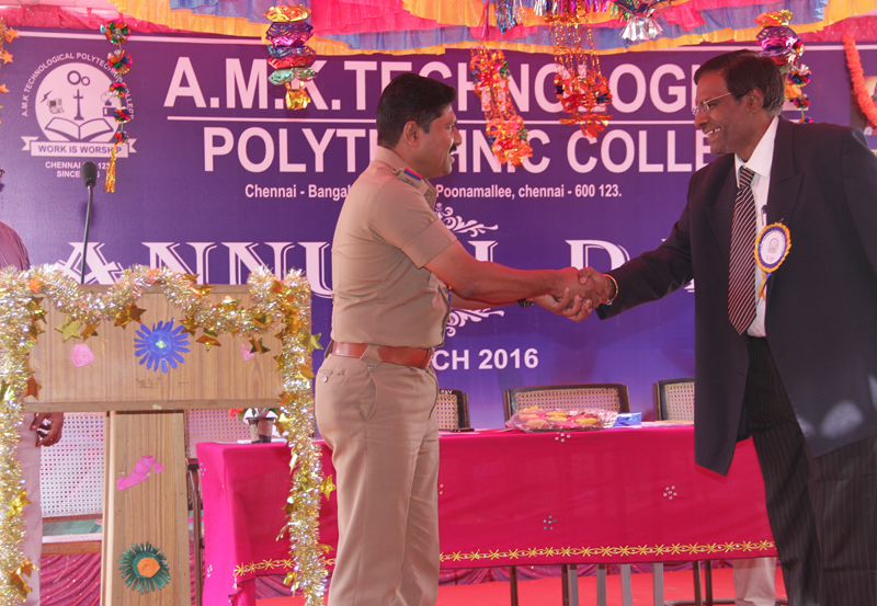 The annual day and sports for the polytechnic was conducted at our college on 09.03.2016. Thiru R.Perundurai Murugan, Inspector of Police, Nazarathpettai,  Chennai 600 123 was the chief Guest and emphasized the role of parents and teachers to bring the students in a better manner and also he requested the students to realize their duties. The above points were delivered in a witty and enjoyable fashion in his valuable speech.